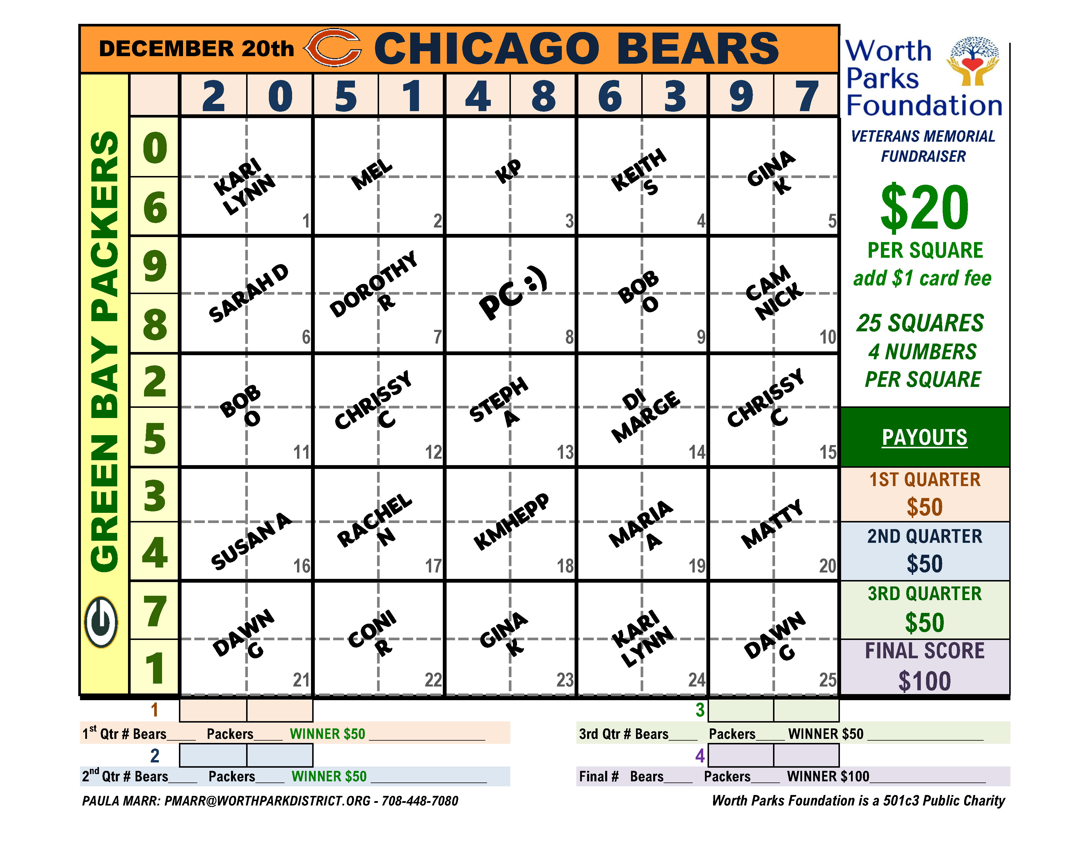 - Since this is a Fundraiser, 50% of the proceeds will go to the Worth Parks Foundation/Veterans Memorial, and the other 50% will be distributed among the Players with the Winning Square.